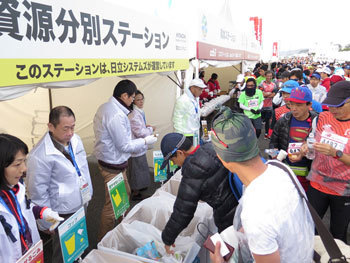 当社はエコ・フレンドシップが掲げる「環境にやさしいマラソン大会の実現」に賛同し、9回目の参加となる今回も、会場での資源分別のお手伝いと、分別されたペットボトルの回収とリサイクルを行いました。