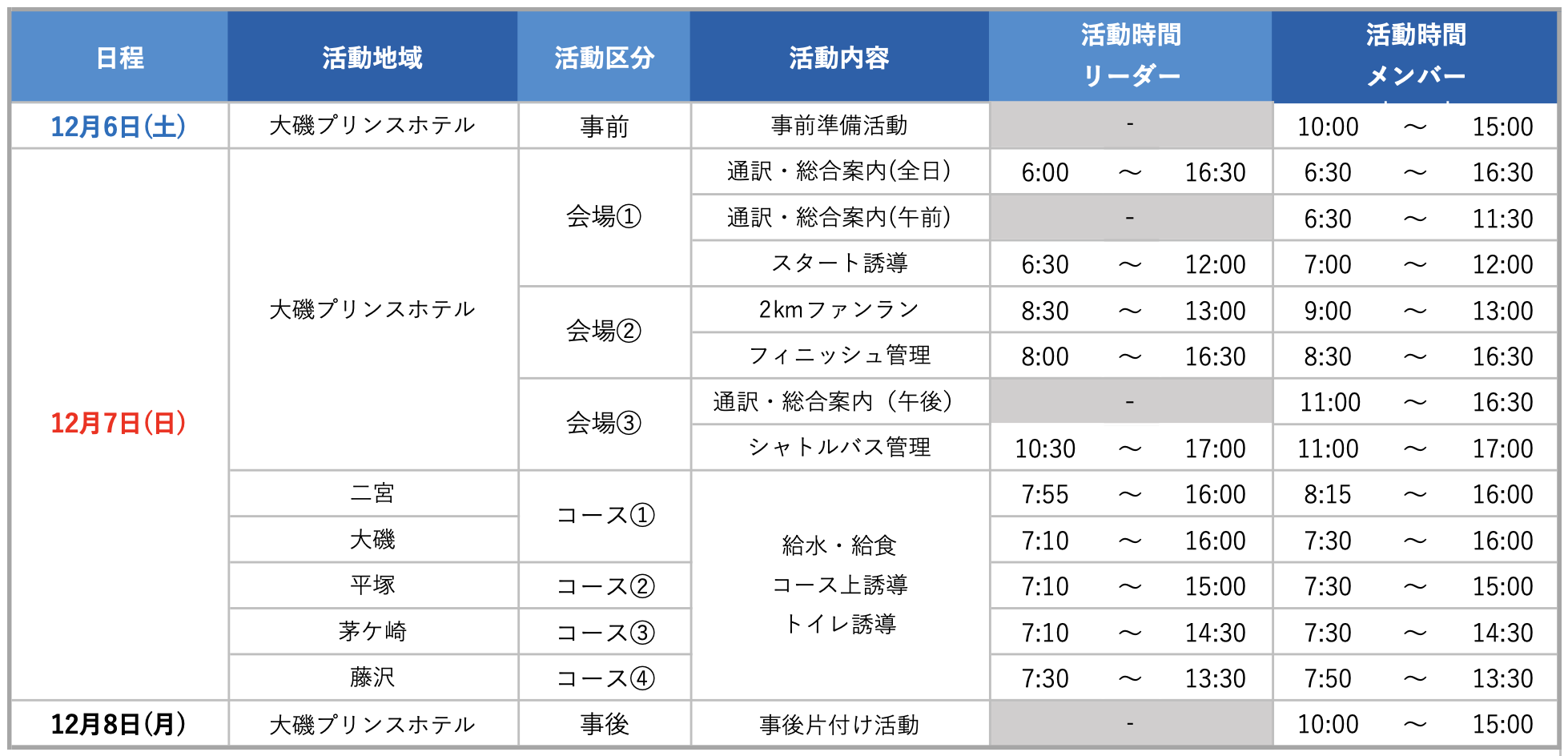 ・活動当日は、寒暖差対策をして動きやすい服装でお越しください。また、支給されたスタッフウェア・キャップ・IDなどは活動中必ず着用してください。