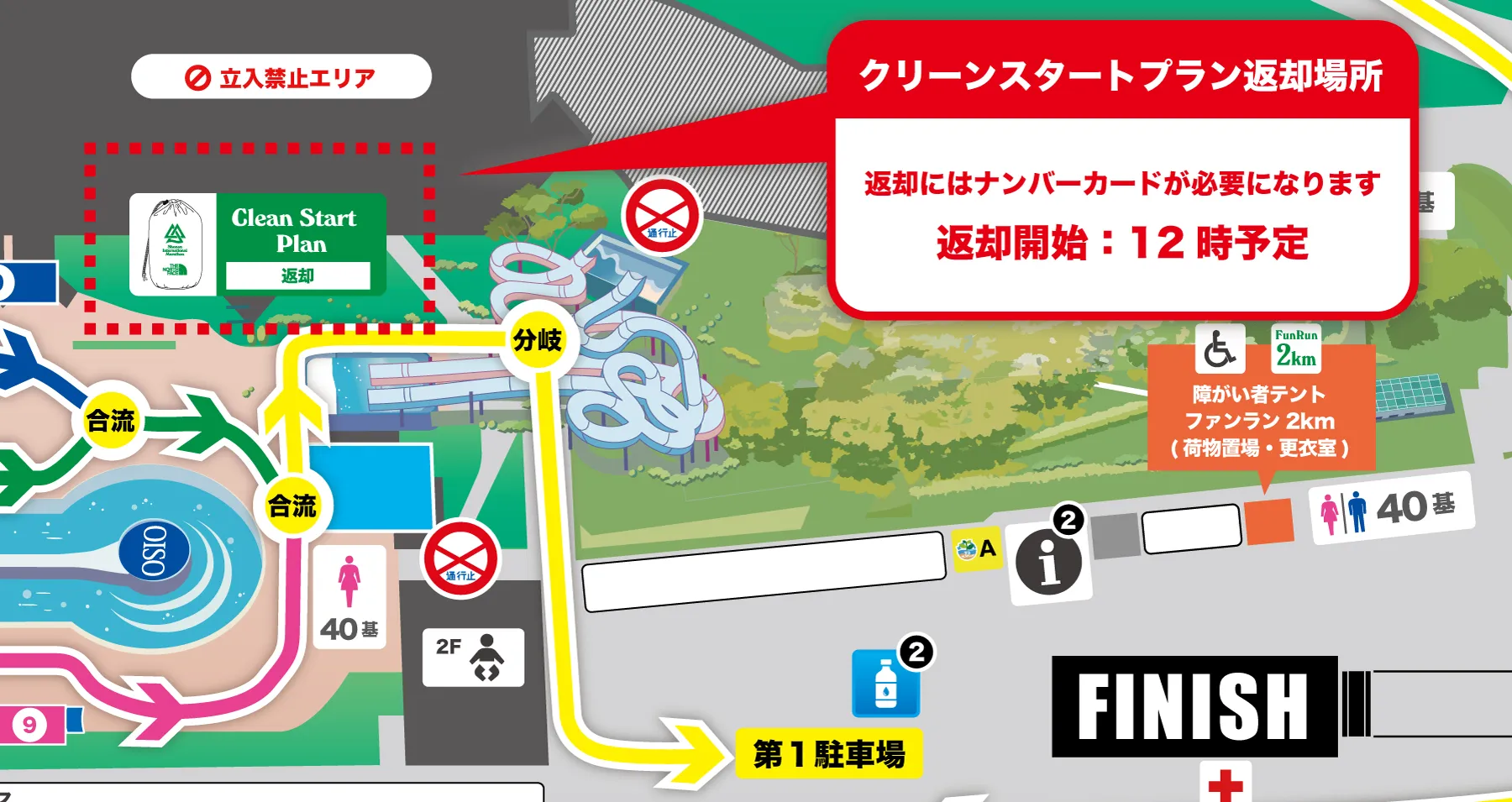 回収BOXへ入れたウェアはレース後、大会会場内の「クリーンスタートプラン返却場所」にて受け取ってください。