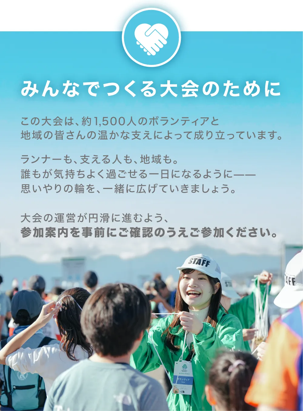 事前事項について 事前発送物 マイボトル 伴走・介助 ペースメーカー エコ・フレンドシップ 大会当日について スケジュール 会場 コース給水 アクセス 救護体制体調管理 CleanStart Plan Tシャツシューズ回収 ファンラン2km ラン&ウォーク その他 交通規制 応援の方 スポンサーサポーター チャリティ