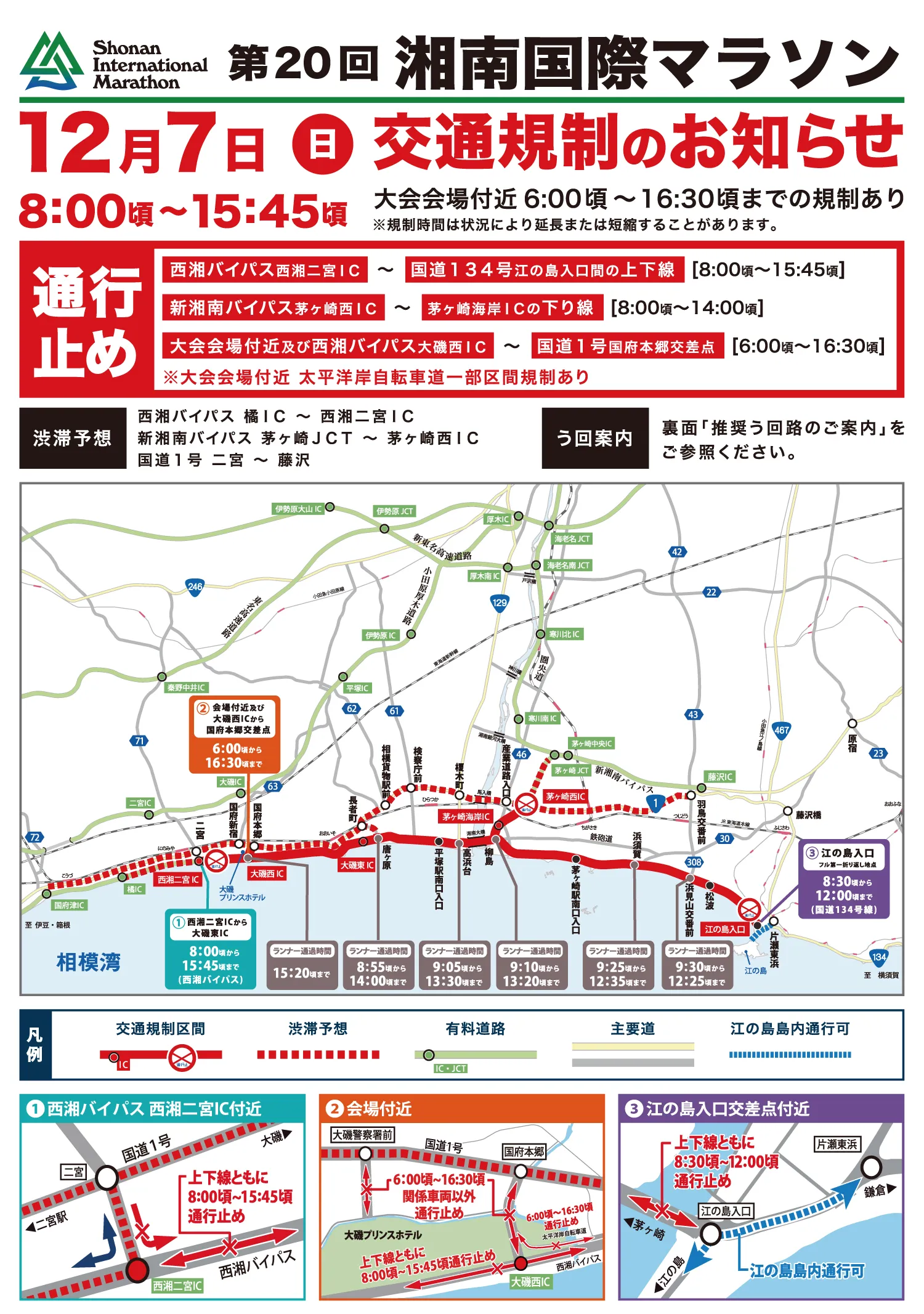 2025年12月7日(日)は、「湘南国際マラソン」の開催に伴い、会場およびコース周辺道路では、交通規制が行われます。